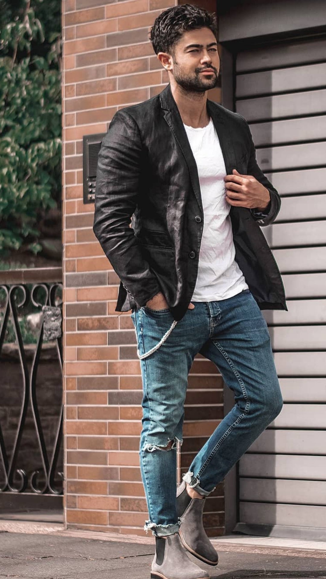 This outfit is proof which you could make even informal jackets appear a lot dressier if you understand how to actually use their shade to your benefit. The gray of the jacket is left undisturbed with the plain white tee, and the black trousers permit the jacket to take centre-stage, although the entire shade palette is modest.