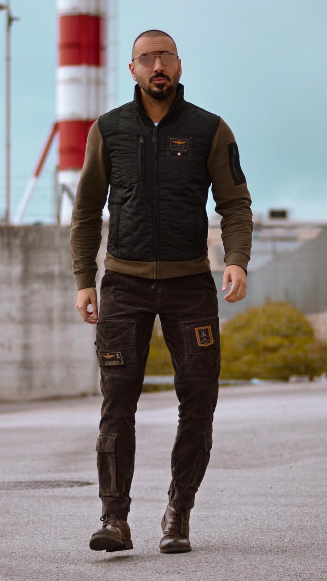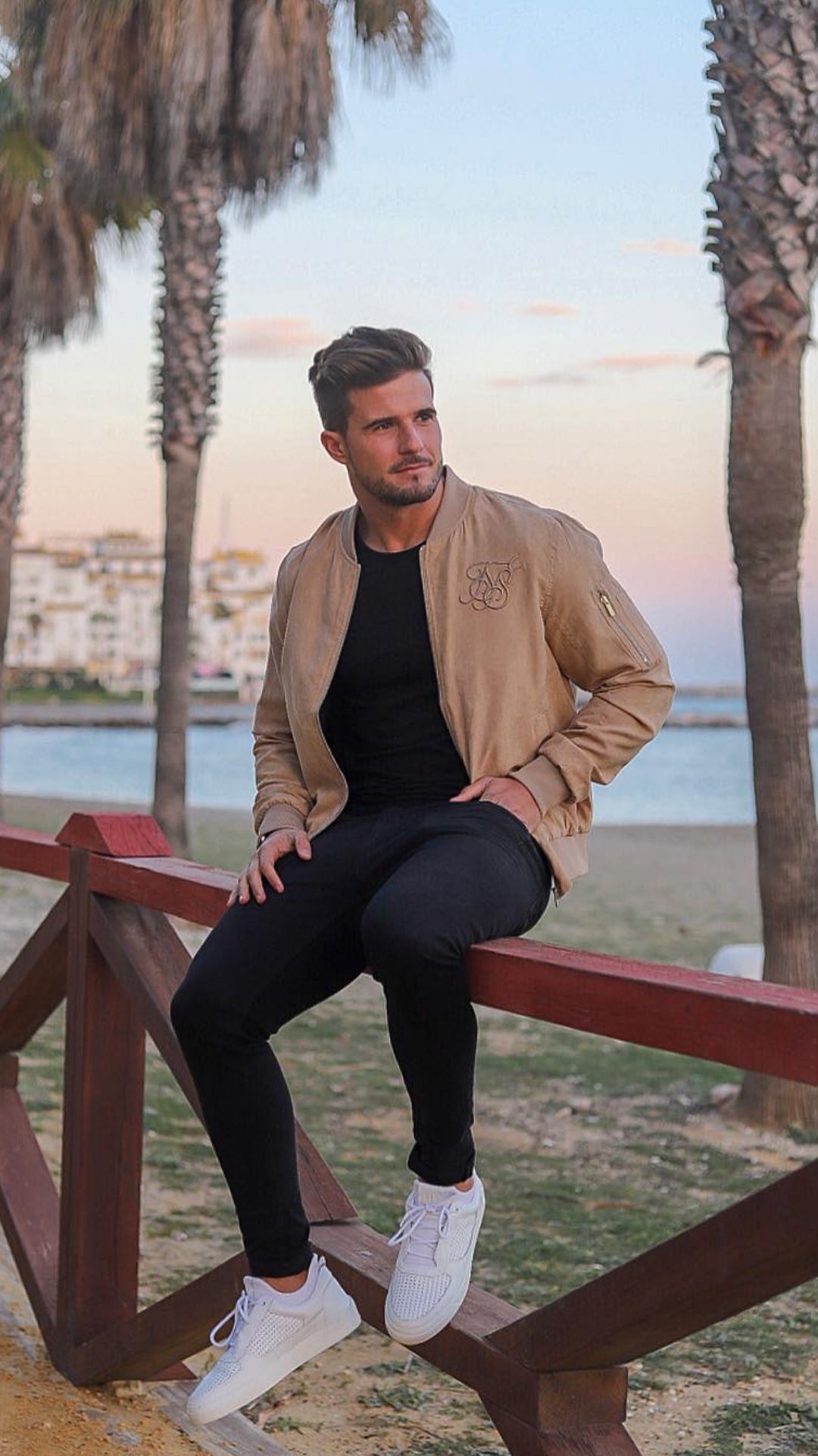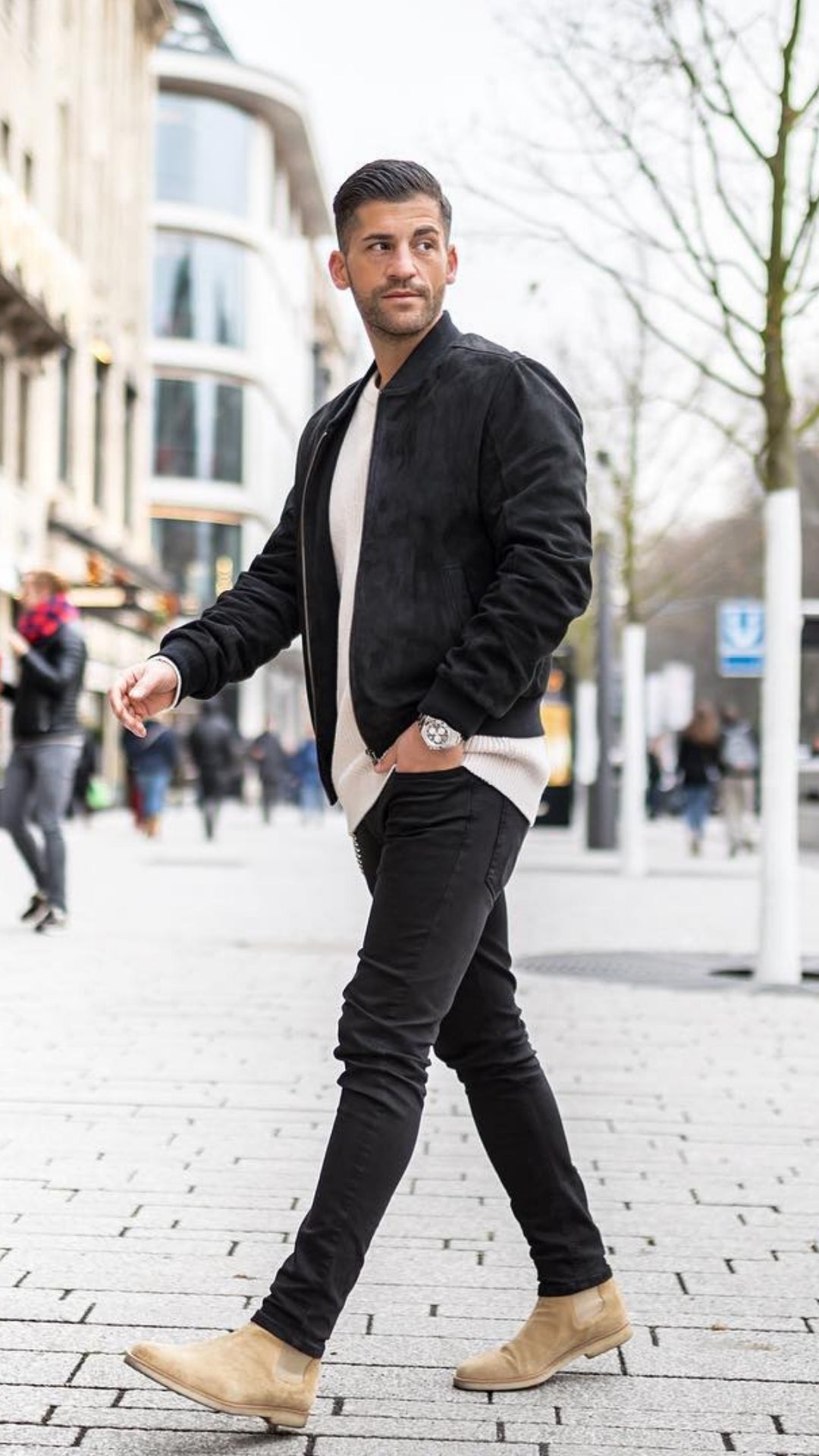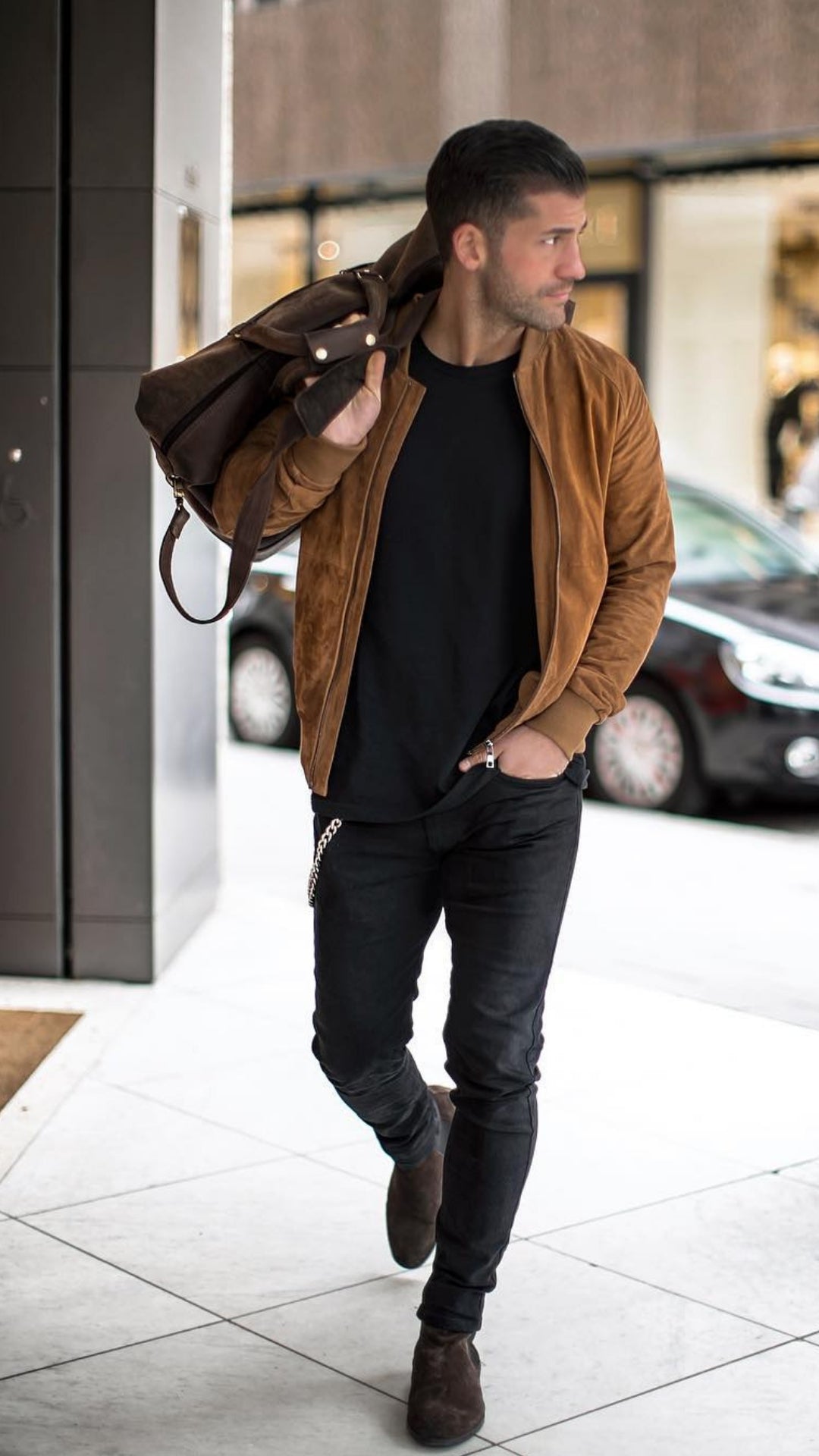 You can too maintain the suede sneakers in an identical shade palette, a darkish brown maybe, if you wish to break the monotone with solely ingredient of the look – which, on this case, is a brown bomber jacket that pops out in a barely extra vibrant shade towards the black parts of the look.