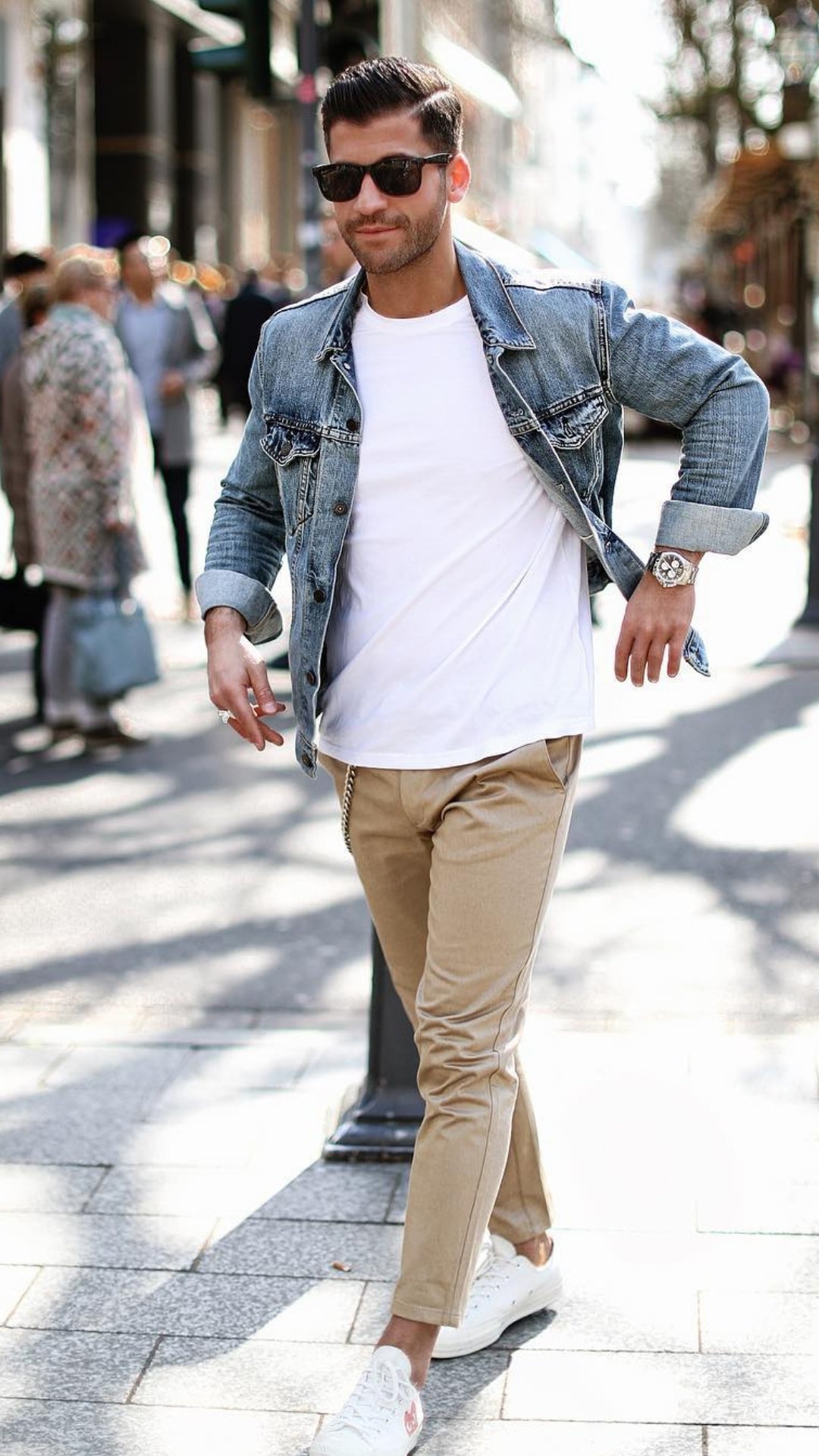 You can too go for a pair of chinos which can be nearly ankle-length to make the look much more laid again. End the look with a pair of white sneakers and a few darkish shades.