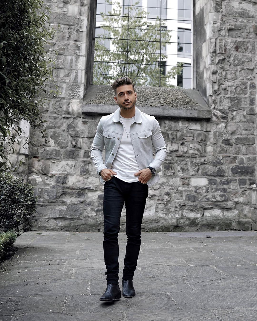 This outfit is proof which you could make even informal jackets appear a lot dressier if you understand how to actually use their shade to your benefit. The gray of the jacket is left undisturbed with the plain white tee, and the black trousers permit the jacket to take centre-stage, although the entire shade palette is modest.